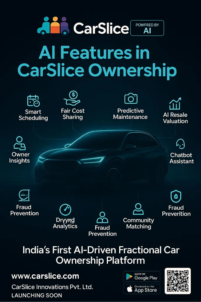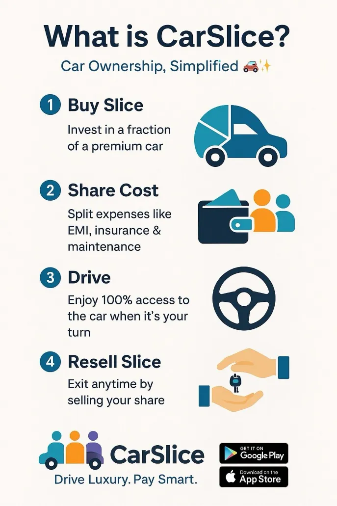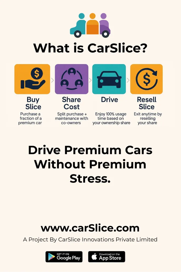 CarSlice is India’s first AI-powered platform that offers Fractional Car Ownership. Instead of buying an entire premium or luxury car, you can own a fraction (ticket share) of it and enjoy both usage and investment benefits.