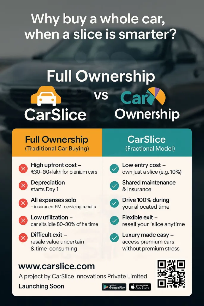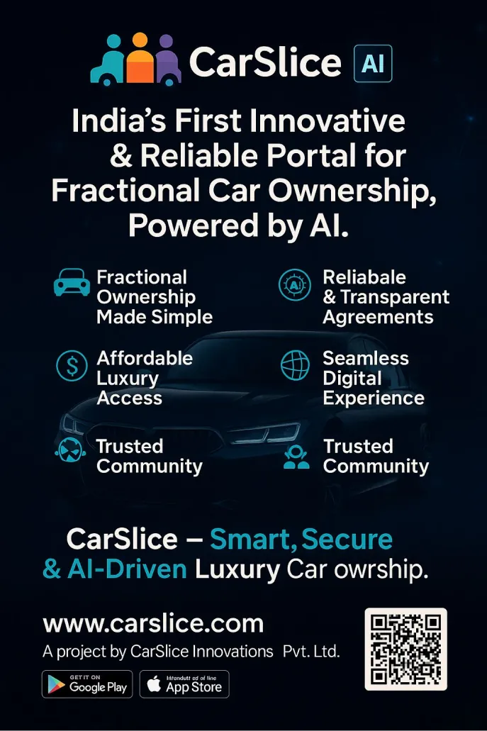 CarSlice is India’s first AI powered premium fractional car ownership platform, making luxury mobility affordable, accessible, and investment-driven. We redefine how India experiences premium cars by allowing individuals and businesses to co-own world-class vehicles—driving them when they want, while enjoying cost efficiency, flexibility, and the prestige of ownership.